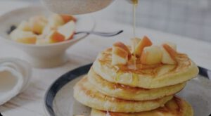 Apfelwürfel mit Zimtpulver in der Pfanne andünsten, Pancakes stapeln, Apfelwürfel auf die Pancakes geben und mit Ahornsirup beträufeln.