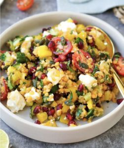 In einer großen Schüssel die Roten Linsen mit dem kleingeschnittenen Gemüse, den Granatapfelkernen und den Kürbiskernen vermischen.